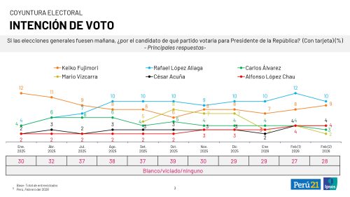 / | Deja un ComentarioIntención de voto ! Elecciones Perú 2026 ! al 28 de febrero. Porky , Rafael Lopez Aliaga baja 2 puntos ( 9%) y Keiko Fujimori sube un punto (8%) , le sigue el casco Alfonso…..