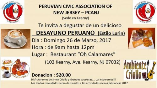 Peruvian Civic Associastion of N.J te invita a su Desayuno Peruano , Marzo 26